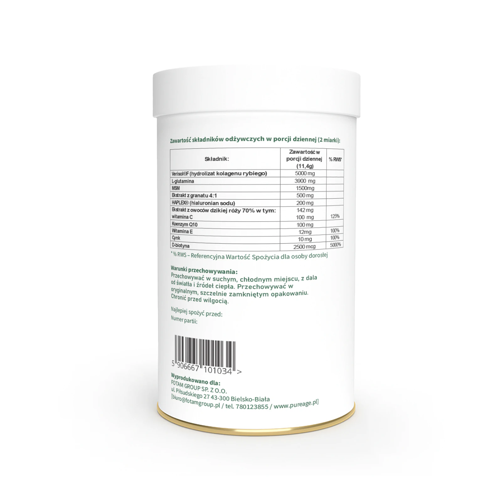Beauty Collagen marki Pure Age to suplement diety zawierający kompozycję bioaktywnych składników wspierających prawidłowy stan skóry, włosów, paznokci oraz naturalne procesy regeneracji organizmu. Produkt oparty jest na opatentowanych peptydach kolagenowych VERISOL®, wzbogacony o L-glutaminę, MSM, kwas hialuronowy oraz kompleks witamin i minerałów o udowodnionym działaniu fizjologicznym.